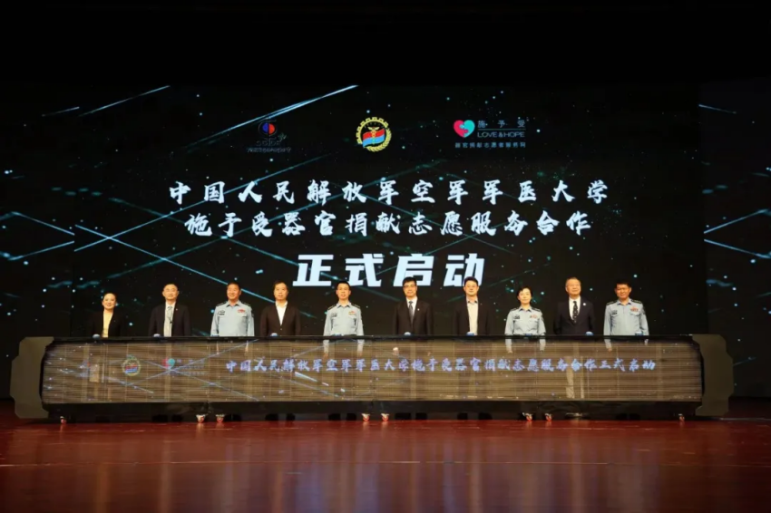 许培海书记、赵洪涛理事长、蒲苗秘书长、黄斌处长、杨春风副政委、党小荣院长、王敬博院长、林艳副院长、陈忠华教授、霍枫教授共同按下启动按钮,中国人民解放军空军军医大学正式启动施予受器官捐献志愿服务合作